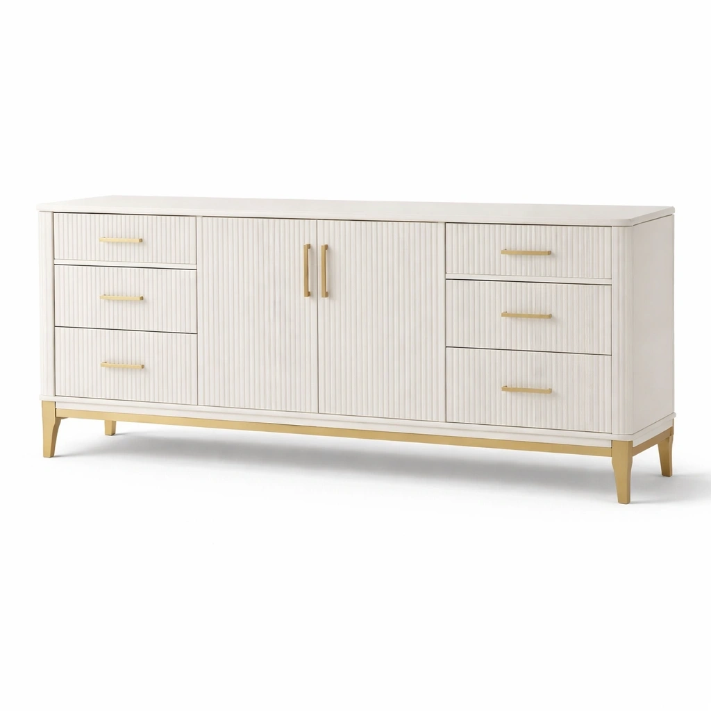 decrire:Plusieurs tiroirs compartiment central structure robuste finition blanche lignes striees design moderne rangement organise ideal salle a manger salon usage quotidien durable pratique
