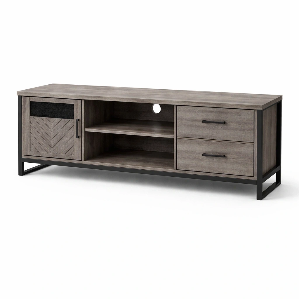 decrire:Structure metal panneaux bois finition industrielle tiroirs lateraux espace central ouvert pour appareils design robuste stable rangement fonctionnel ideal salon moderne usage durable