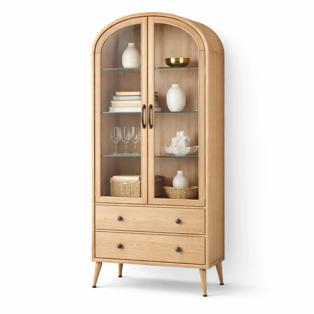 decrire:Portes verre tiroirs inferieurs structure solide design naturel rangement pratique exposition objets decoratifs vaisselle usage interieur durable harmonieux