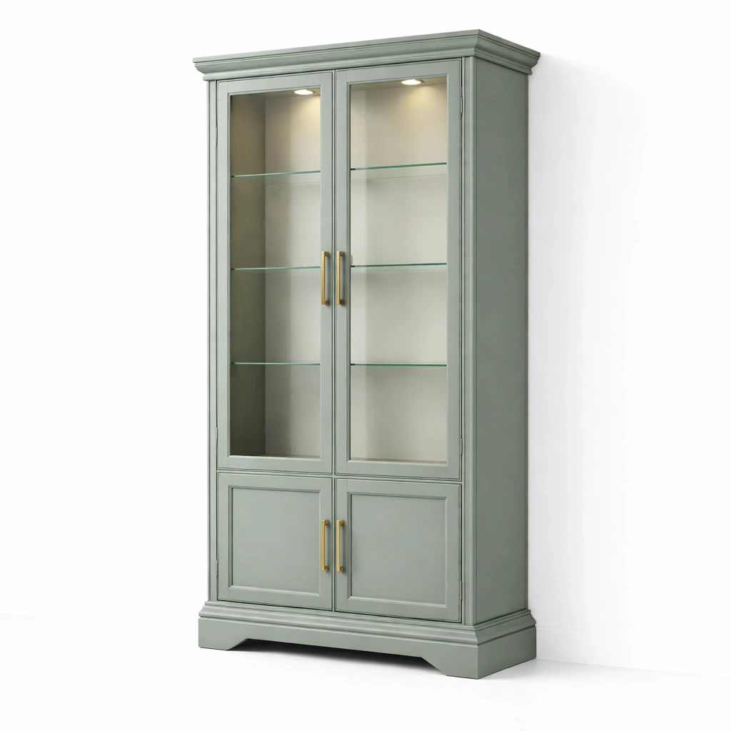 decrire:Portes verre etageres internes eclairage integre structure robuste design elegant ideale pour exposition vaisselle objets decoration usage interieur stable durable